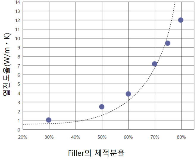 ① 에폭시 수지에 질화알루미늄 필러를 충전했을 때 필러 충전량을 증가시킴으로써 열전도율은 크게 향상됩니다.